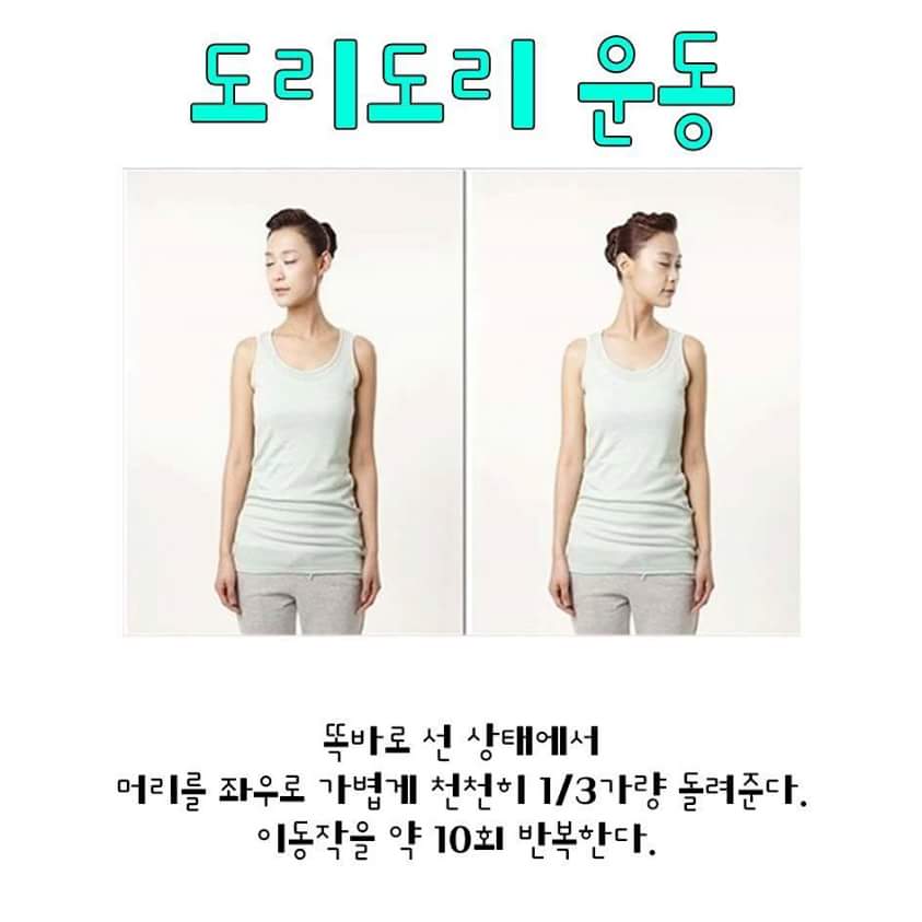 똑바로 선 상태에서 머리를 좌우로 가볍게 천천히 1/3가량 돌려준다.