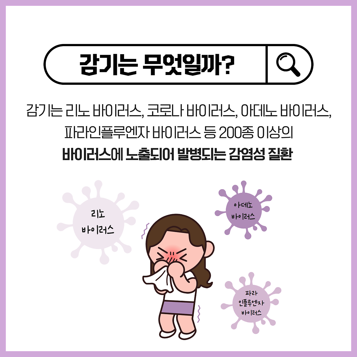 감기는 주로 코와 목 부분에 바이러스가 감염되는 것을 말합니다.