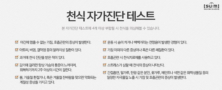 천식은 알레르기 염증으로 인하여 기관지가 좁아지고 호흡 곤란을 유발하는 질병입니다.