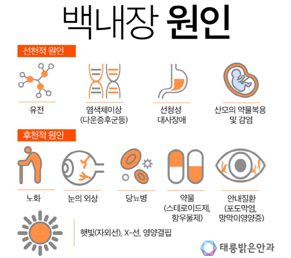 백내장은 주로 노화로 인해 발병하며 다른 원인으로는 유전으로 인하여,