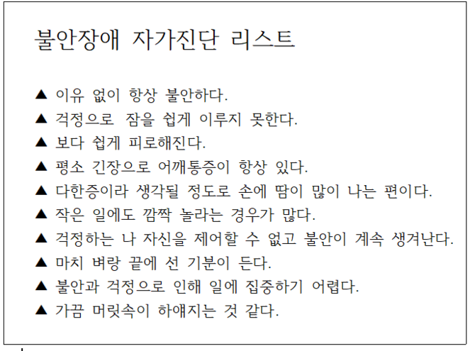 일상생활에서 걱정과 불안감이 느껴지는 것은 당연한 일이지만 지나치게 되면 불안장애가 됩니다.