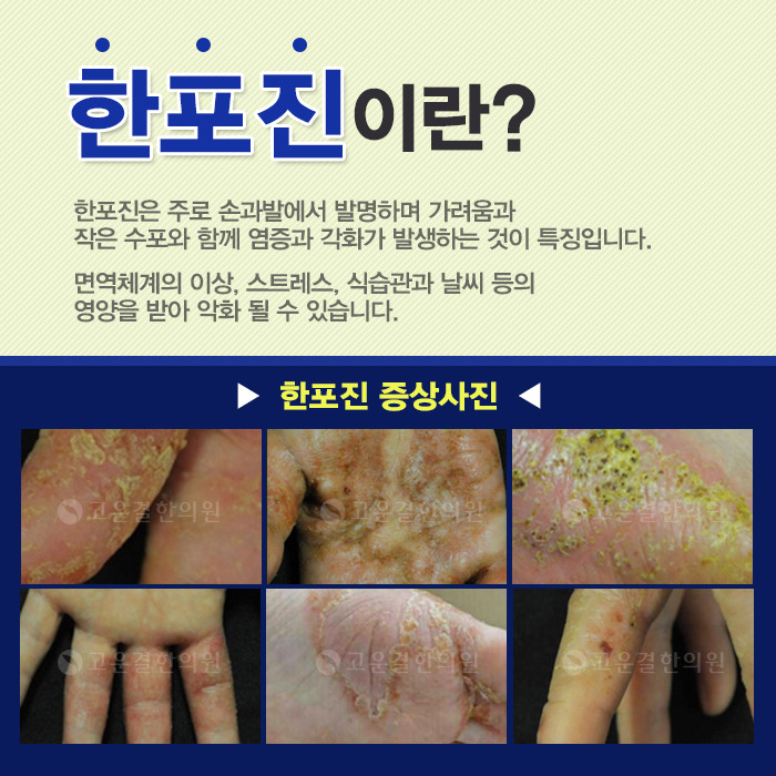 한포진은 손바닥, 발바닥, 손가락에 작은 물집이 생기는 질병을 말합니다.