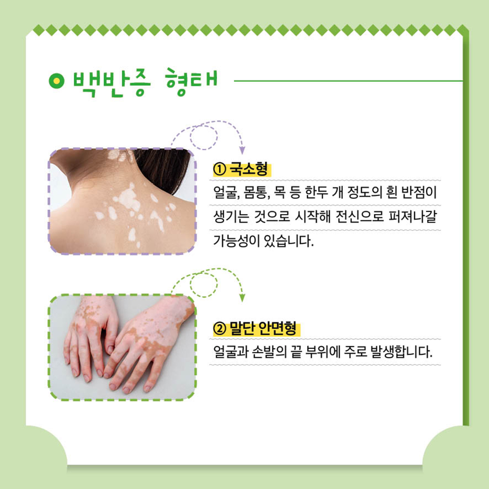 백반증은 멜라닌 세포의 소실로 인하여 피부에 백색반이 나타나는 질환입니다.
