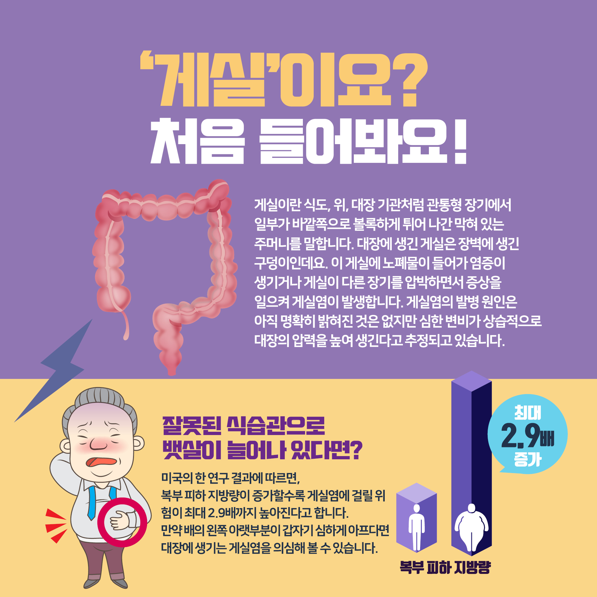 게실염은 위, 식도, 소장, 대장의 장벽이 약해져 주머니 모양의 염증이 생기는 질환입니다.