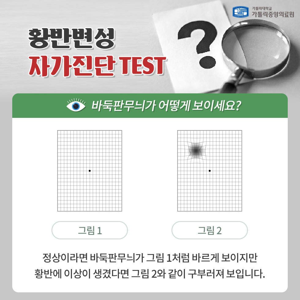 또한 황반변성은 방치하면 시력이 저하되다가 실명을 유발할 수 있어 치료가 필요합니다.